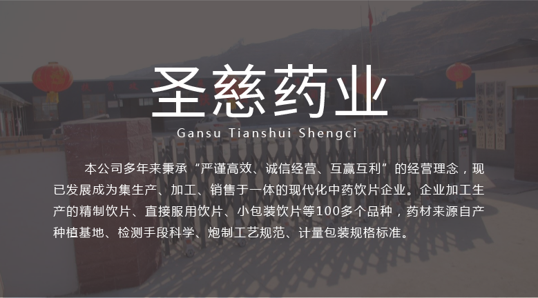 甘肅天水圣慈藥業(yè)有限公司成立于2016年11月8日,注冊資本500萬元,位于甘肅省天水市張川回族自治縣張川鎮(zhèn)中城南路,本公司多年秉承“嚴謹高效、誠信經(jīng)營、互贏互利”的經(jīng)營理念,現(xiàn)已發(fā)展成為集生產(chǎn)、加工、銷售于一體的現(xiàn)代化中藥飲片企業(yè)。企業(yè)加工生產(chǎn)的精制飲片、直接服用飲片、小包裝飲片等100多個品種,藥材來源自產(chǎn)種植基地、檢測手段科學、炮制工藝規(guī)范、計量包裝規(guī)格標準。